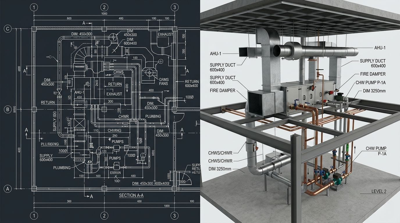 Yes. We convert 2D mechanical drawings into 3D CAD models that help teams visualize spatial relationships, identify coordination issues, and support BIM integration or fabrication planning.